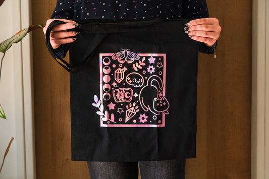 Tote-bag Noir Holographique - Chat ésotérique et carte de tarot