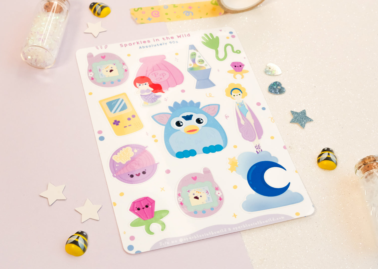 Feuille d’autocollants rétro des années 90, couleurs pastel et résistantes à l’eau 🌟