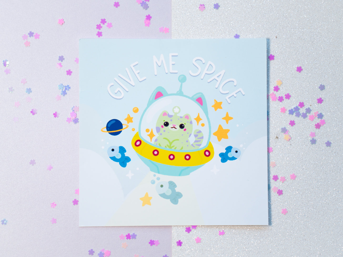 Illustration format carte carrée A6 avec un mignon chat extraterrestre dans son OVNI, parfaite pour offrir ou décorer votre chambre. Les couleurs peuvent légèrement varier en raison des paramètres du moniteur.