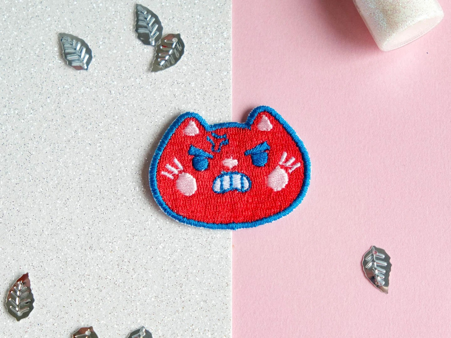 Adorable patch thermocollant chat en colère rouge et bleu pour décorer vestes et jeans !