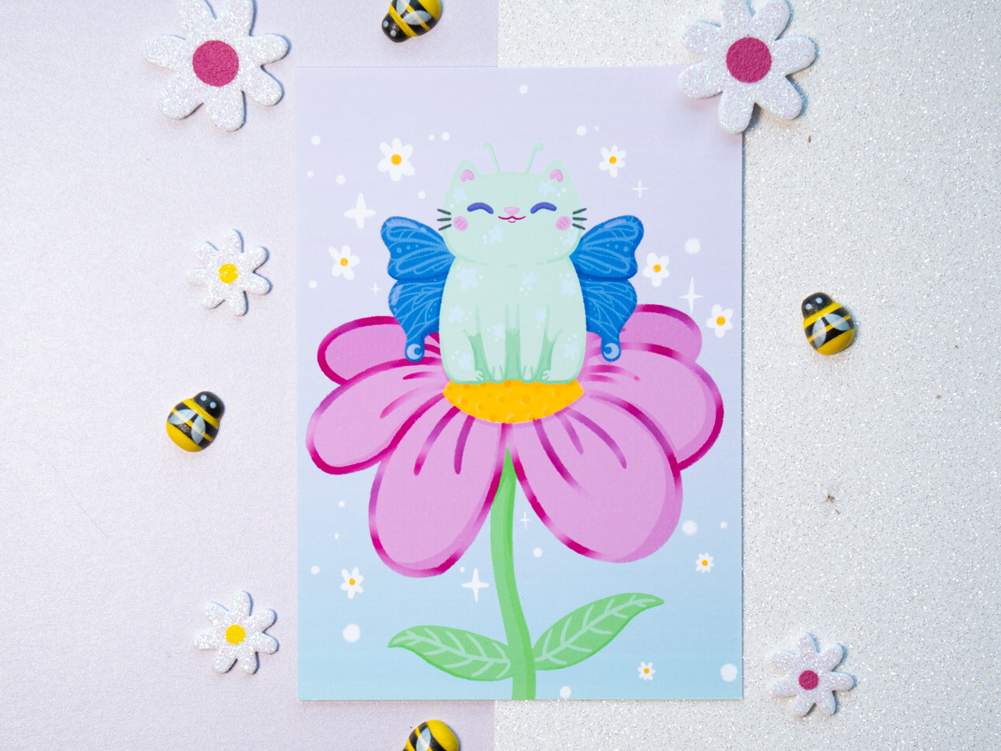 Illustration au format carte A6 avec un joli chat papillon debout sur une fleur, parfaite pour offrir ou décorer votre chambre. Les couleurs peuvent légèrement varier en raison des paramètres du moniteur.