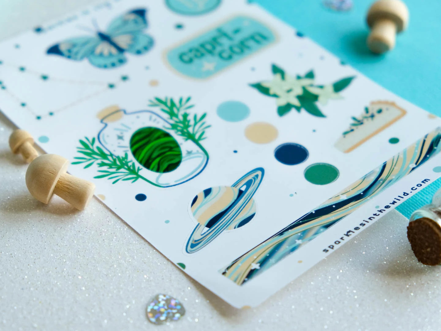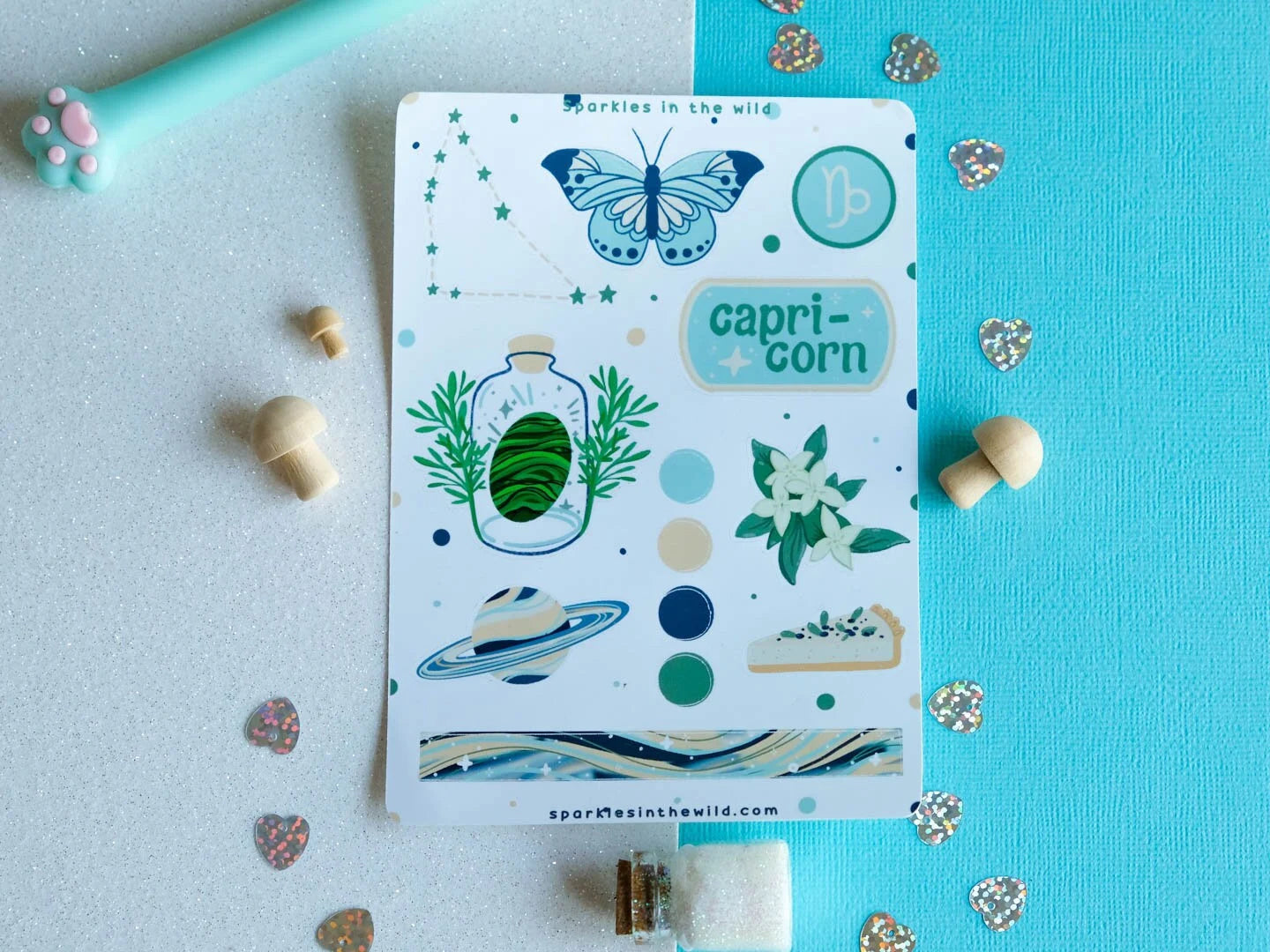 Cette planche d'autocollants comprend une variété de motifs inspirés de l'astrologie, mettant en vedette les symboles du Capricorne, le signe du zodiaque pour les personnes nées entre le 22 décembre et le 20 janvier.