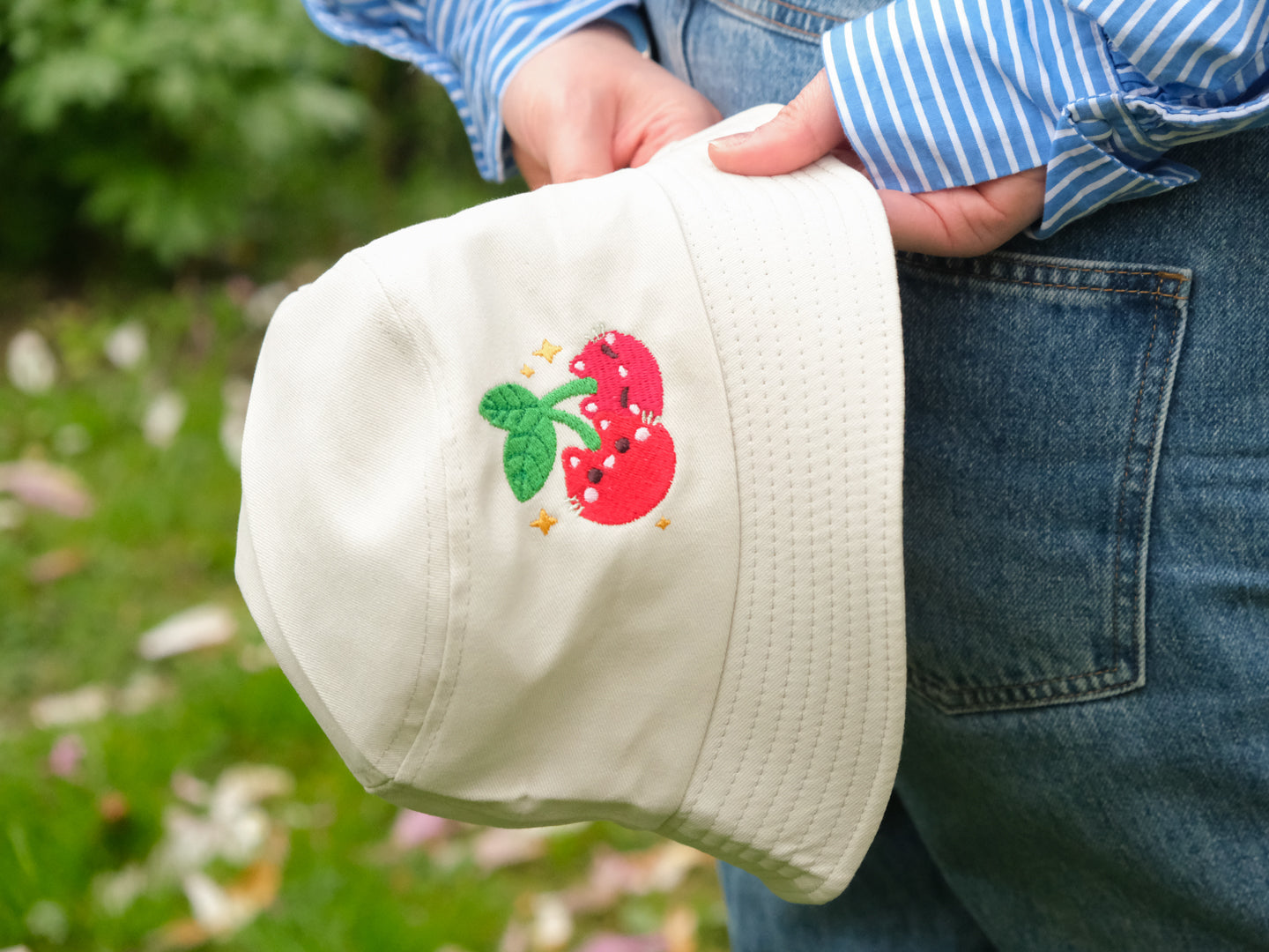 Joli chapeau bob beige à motif chat cerise 🍒🐱
