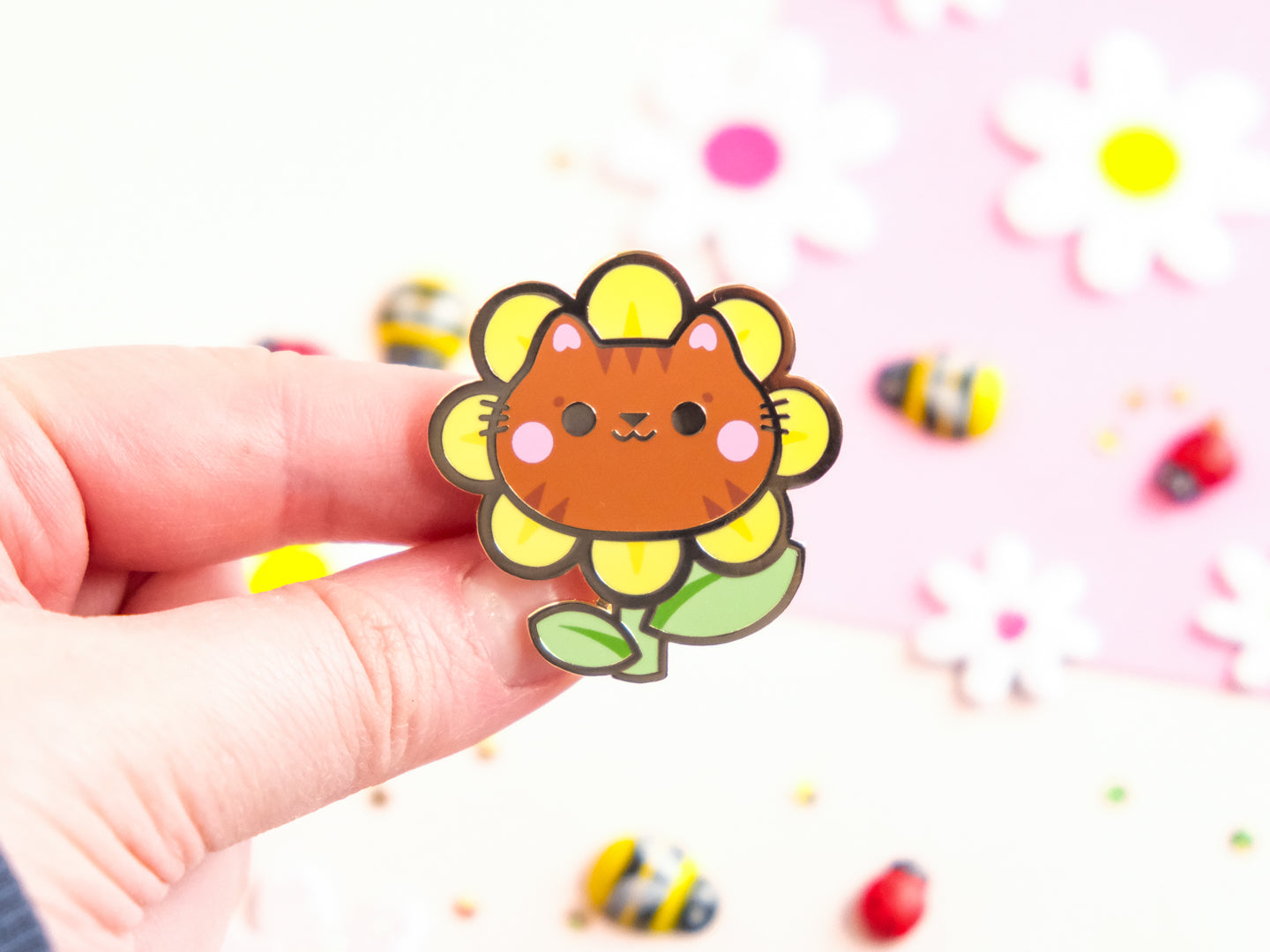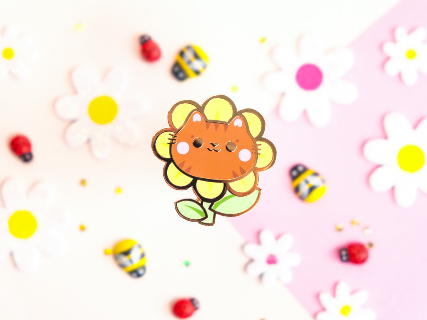 Une jolie tête de chat orange décorée d'une marguerite, adorable et pleine de charme ! Idéale pour égayer votre tenue, votre sac fourre-tout, votre étagère, votre bureau ou votre cœur.