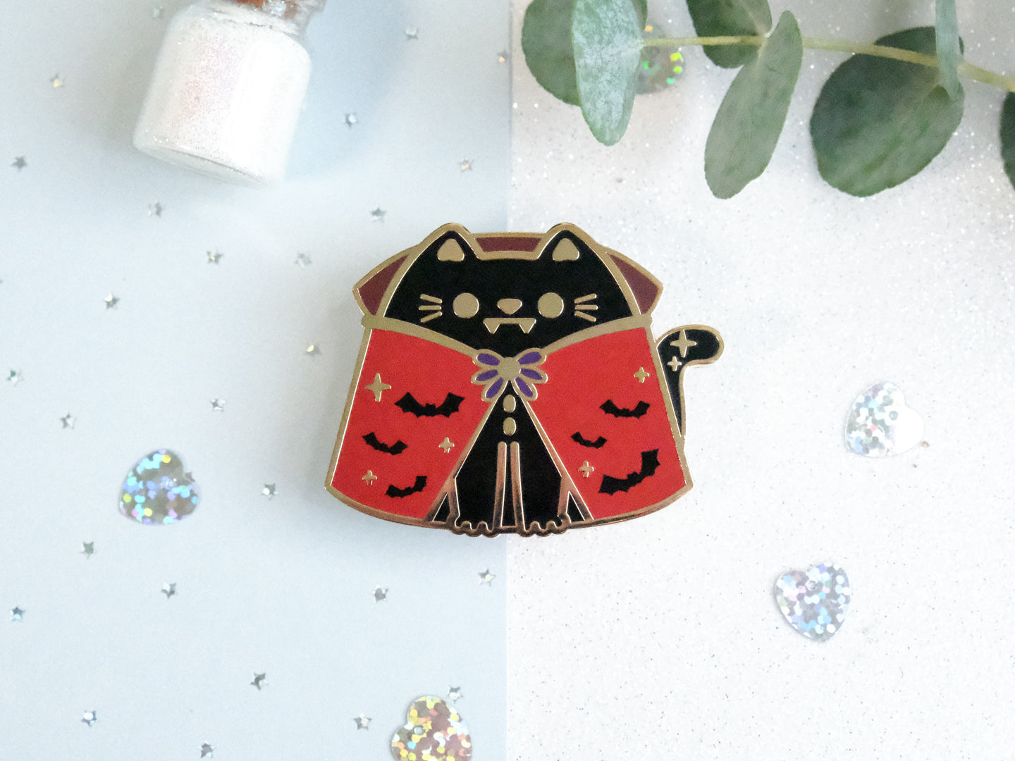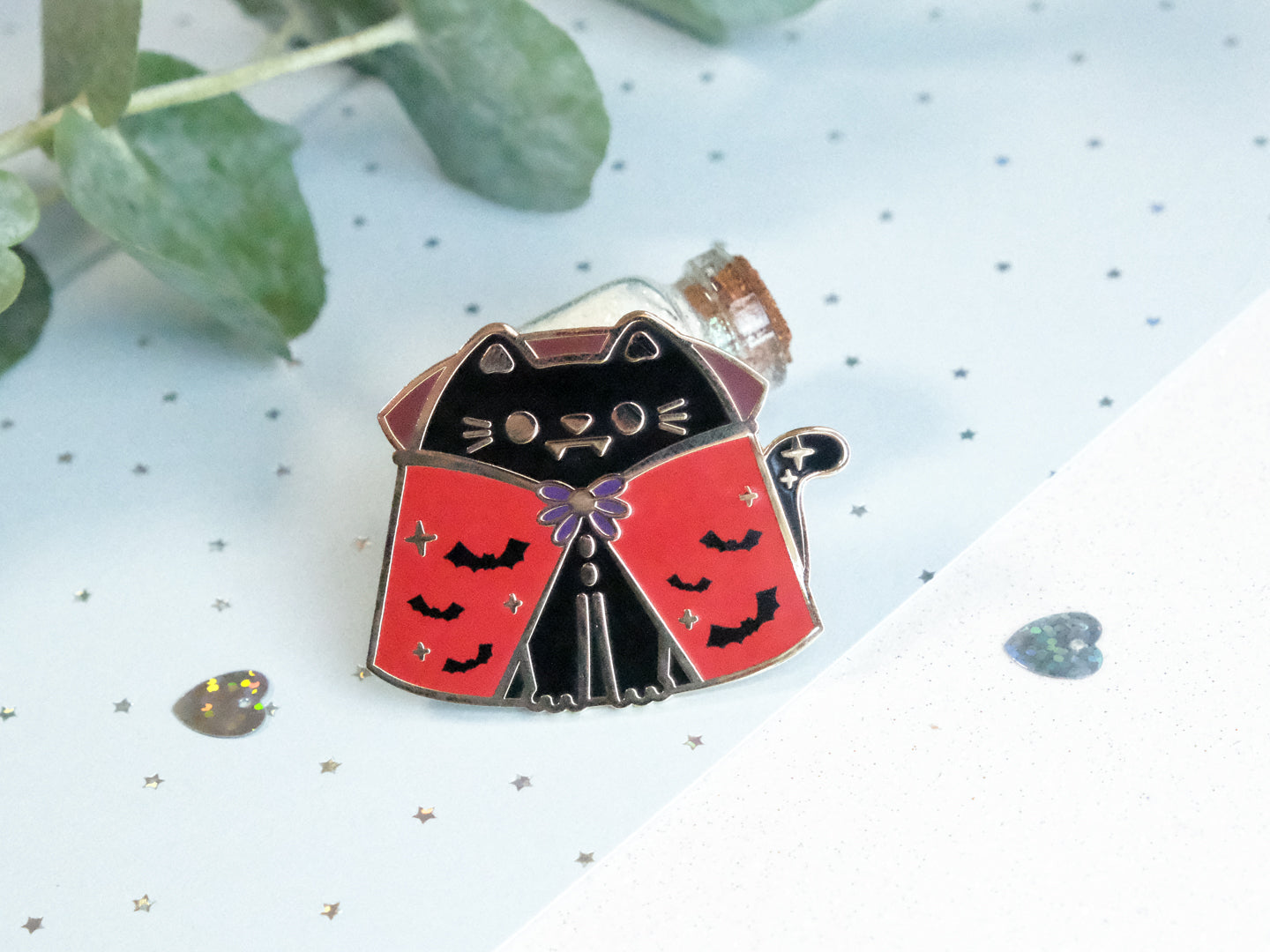 Dracucat - Pin's chat Dracula noir en émail dur pour décorer une veste ou un totebag - Collection Whiskered Wonders
