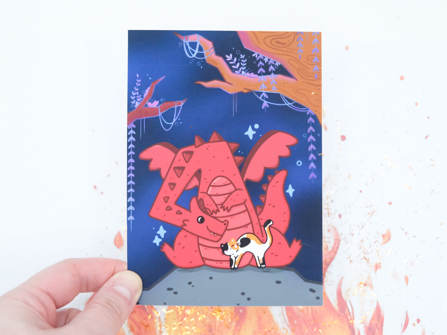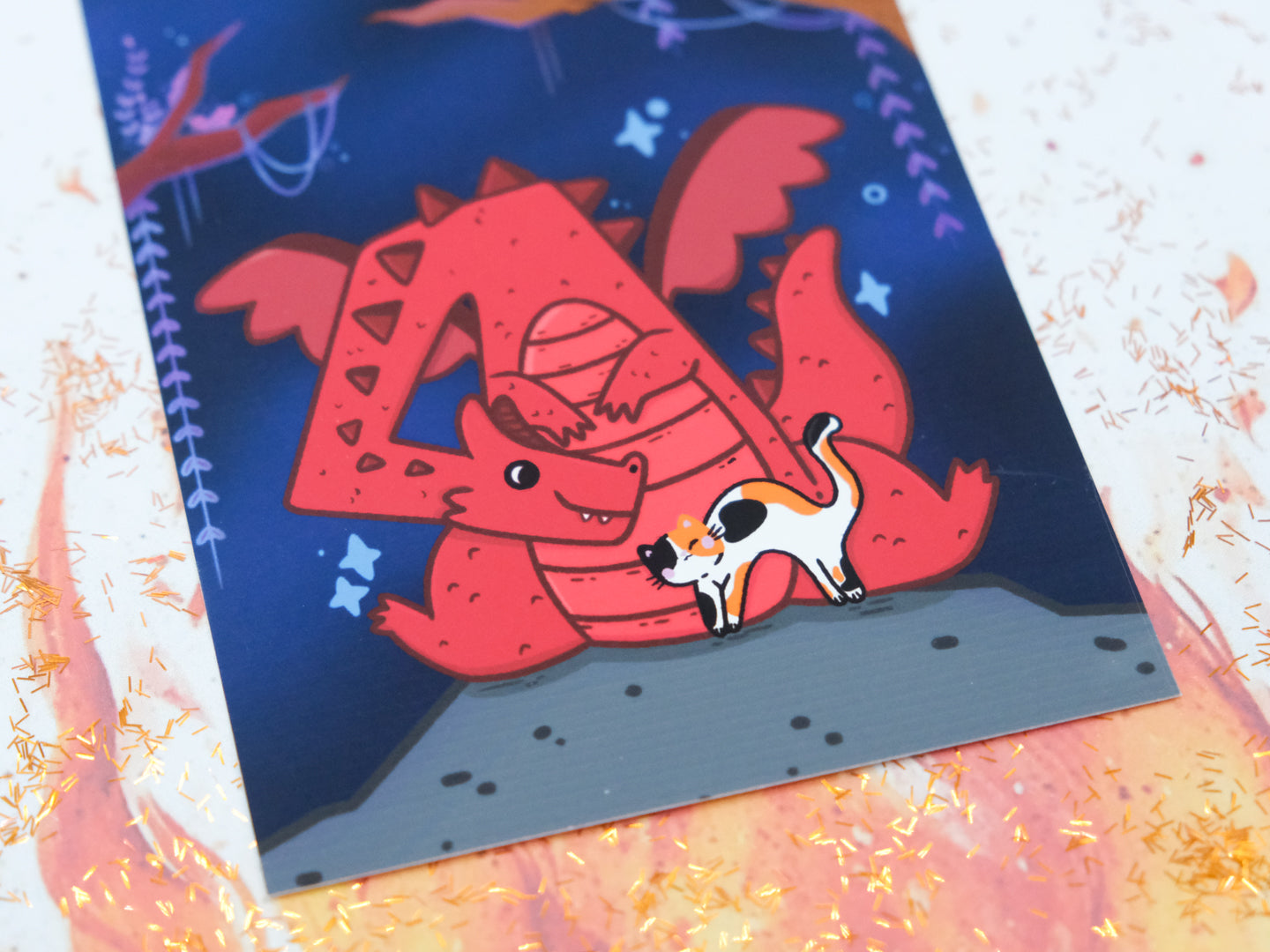 Carte format A6 illustrée d'un mignon dragon dans sa grotte avec son ami chat calico préféré ! Parfait pour offrir ou décorer votre chambre. Les couleurs peuvent légèrement varier en fonction des paramètres de votre écran.