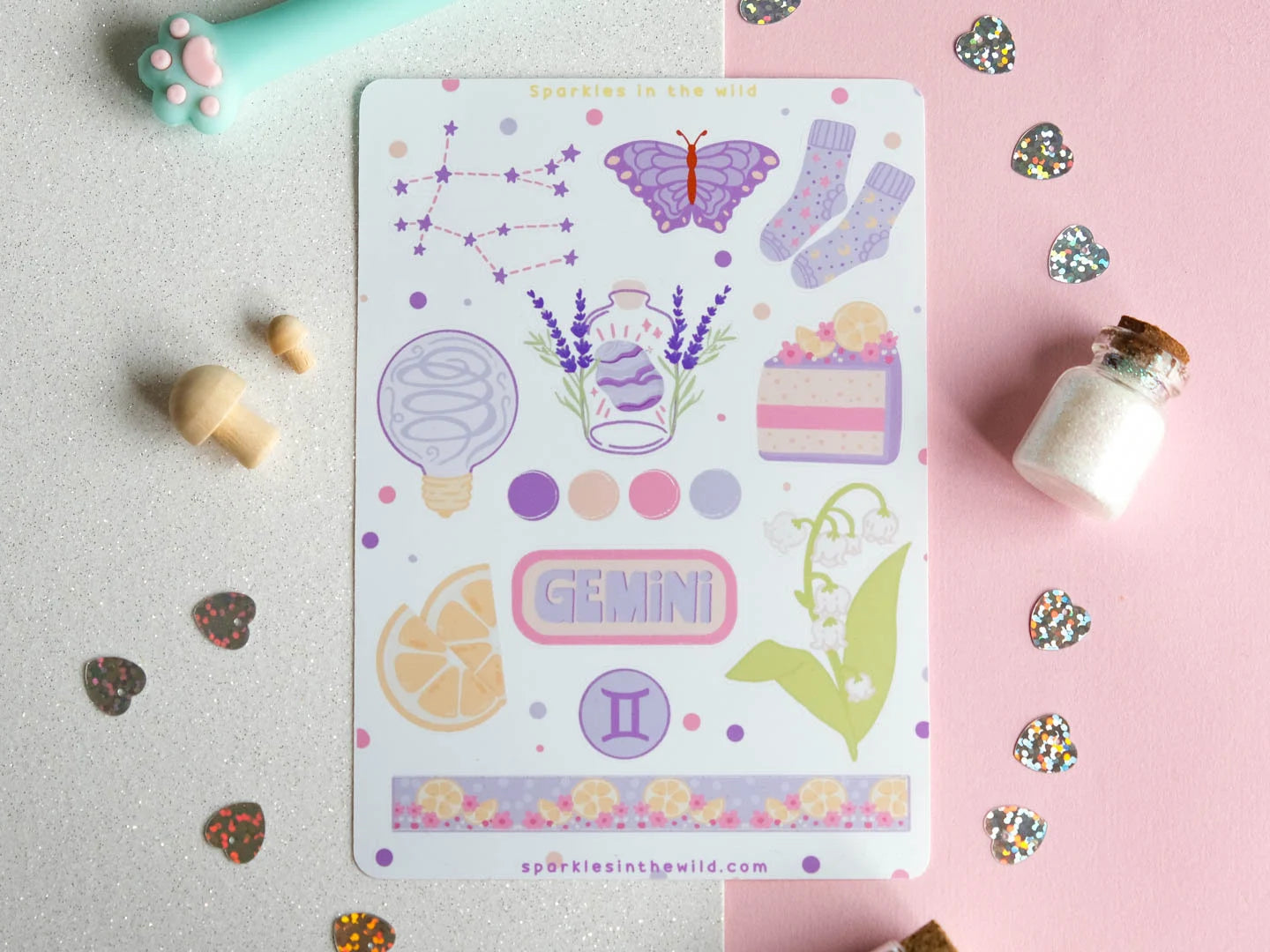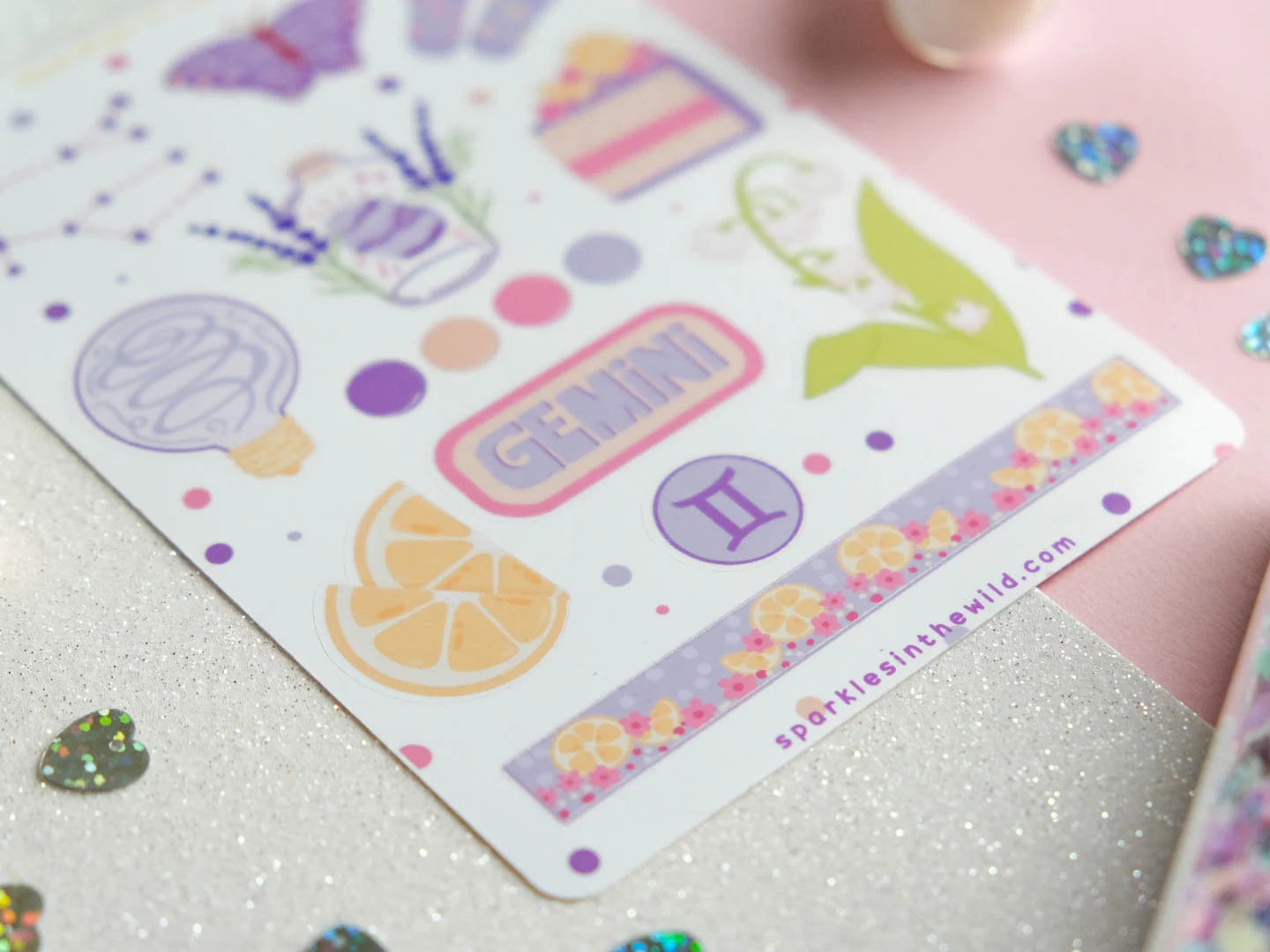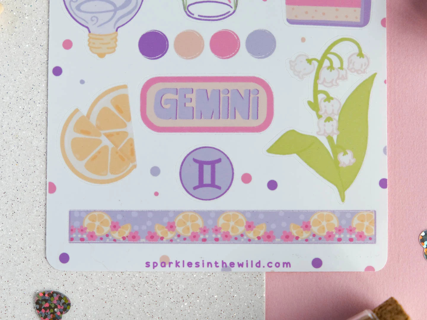 Cette feuille d'autocollants comprend une variété de motifs inspirés de l'astrologie, mettant en vedette les symboles des Gémeaux, le signe du zodiaque pour les personnes nées entre le 21 mai et le 20 juin.