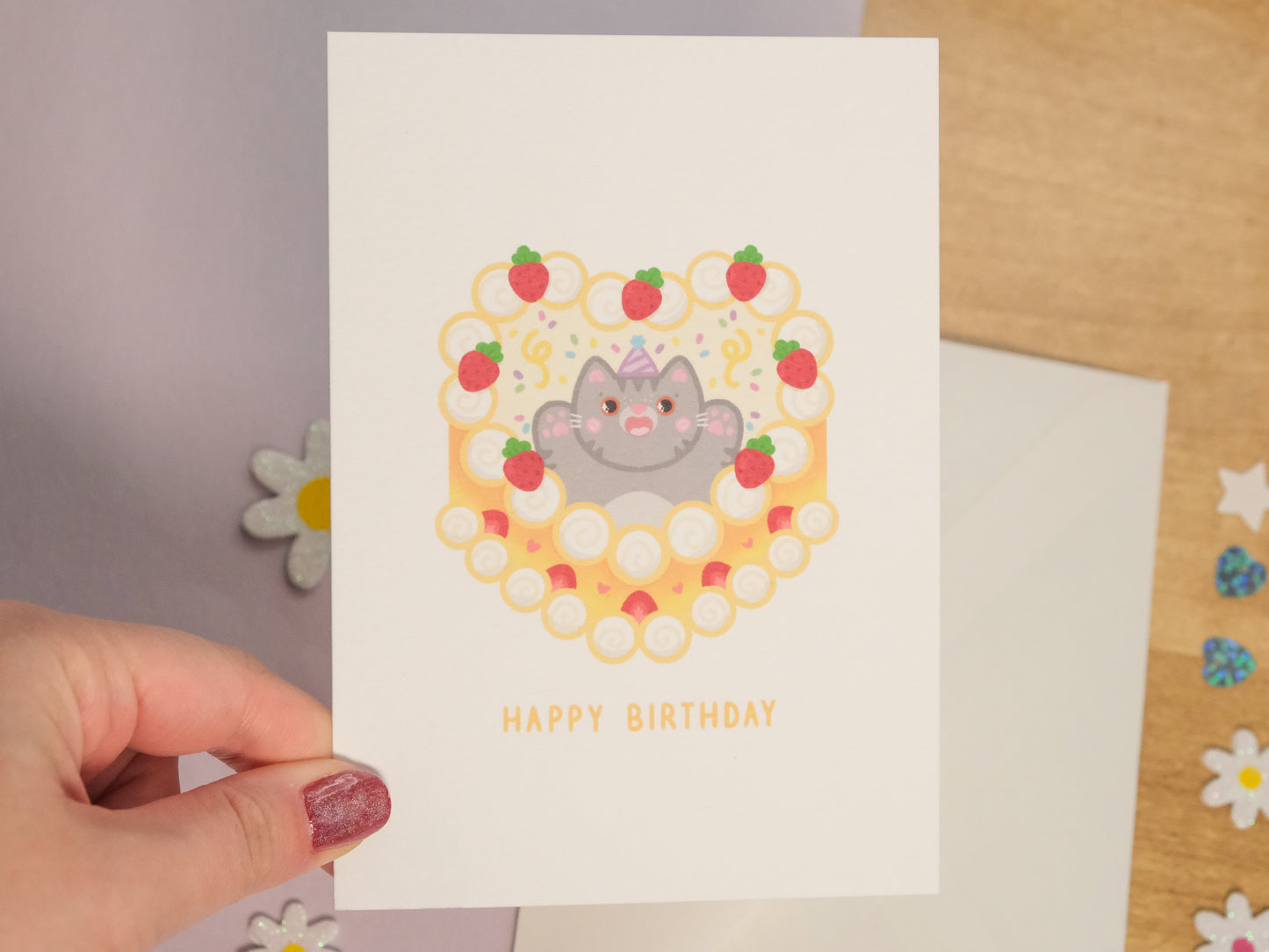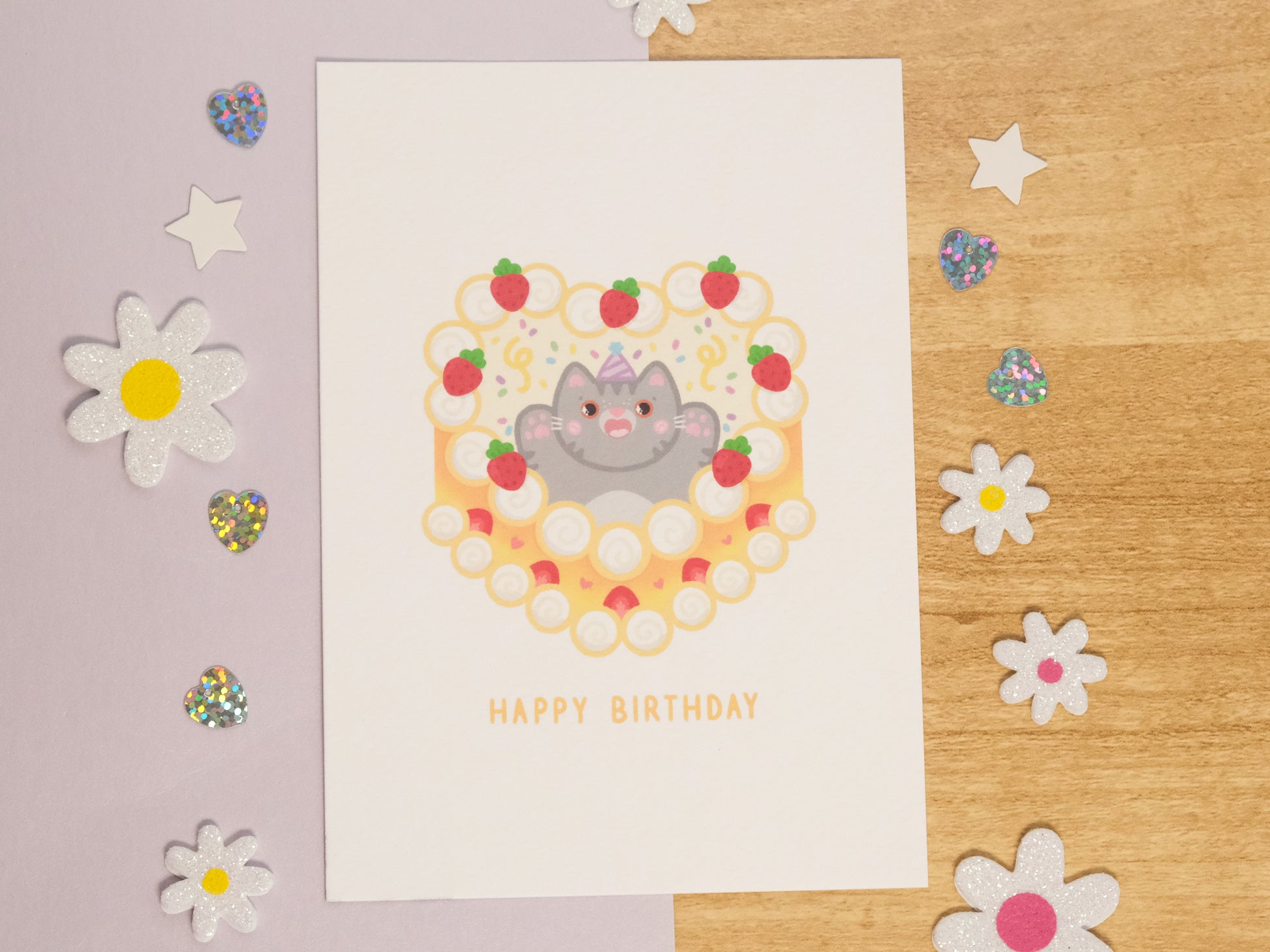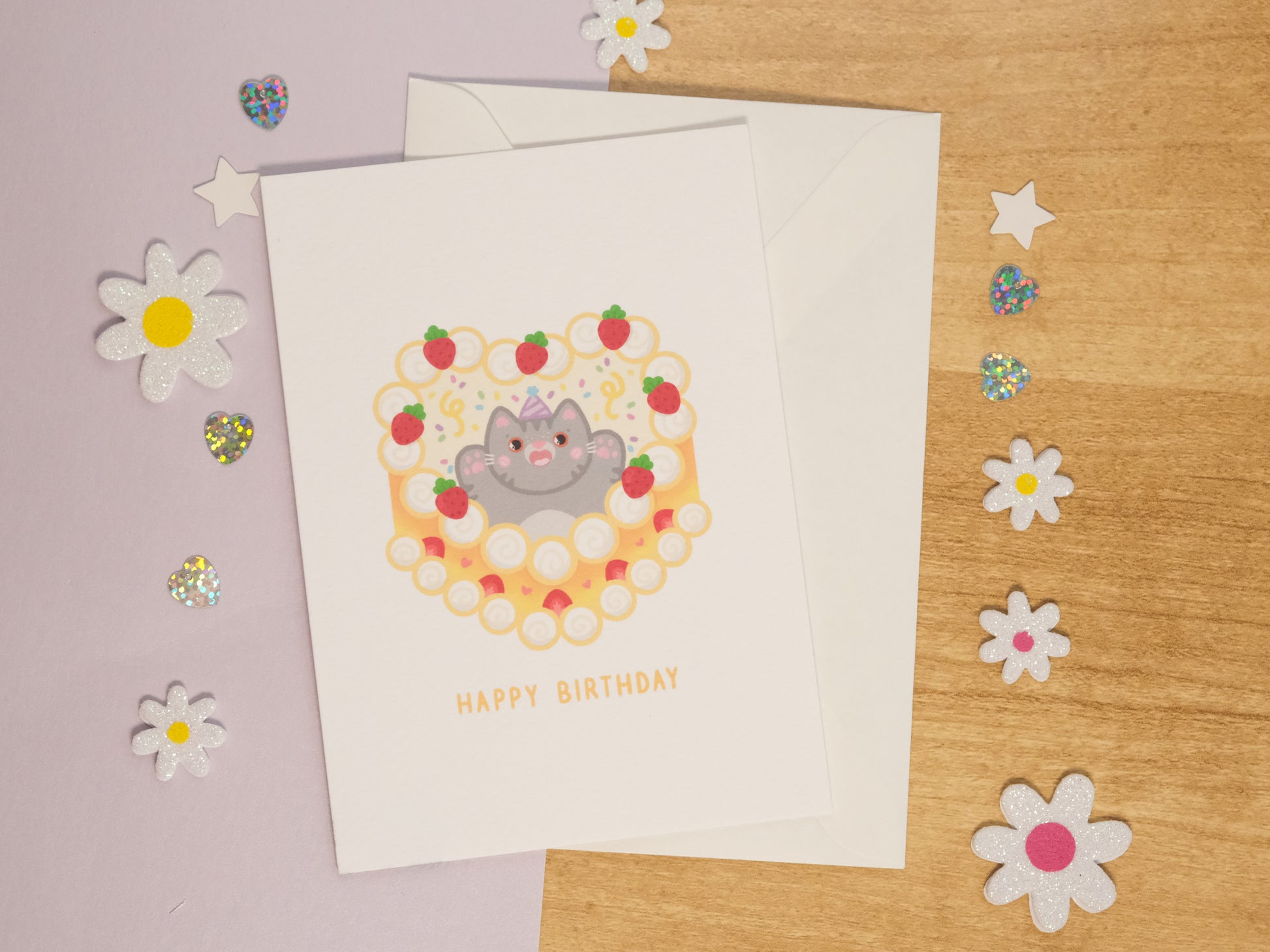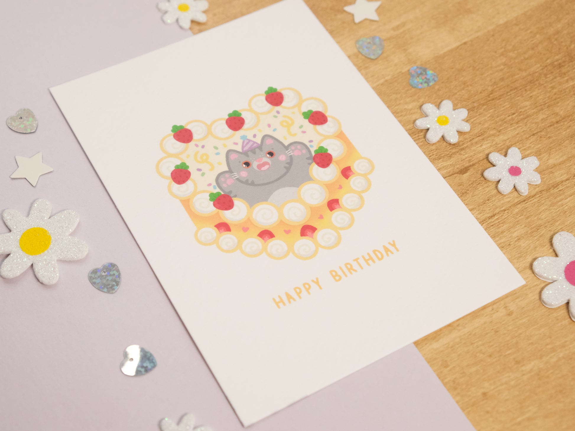 Célébrez avec style avec notre carte de vœux d'anniversaire chat gris et gâteau , dessinée à la main par Sparkles in the Wild, une petite entreprise passionnée par la création d'articles de papeterie adorables inspirés des chats. Présentant un charmant chaton gris perché à côté d'une délicieuse part de gâteau, cette carte apporte un mélange parfait de fantaisie et de douceur à toute célébration d'anniversaire. Idéal comme cadeau attentionné ou comme note spéciale pour un ami, il égayera à coup sûr sa journée avec une touche de charme kawaii !