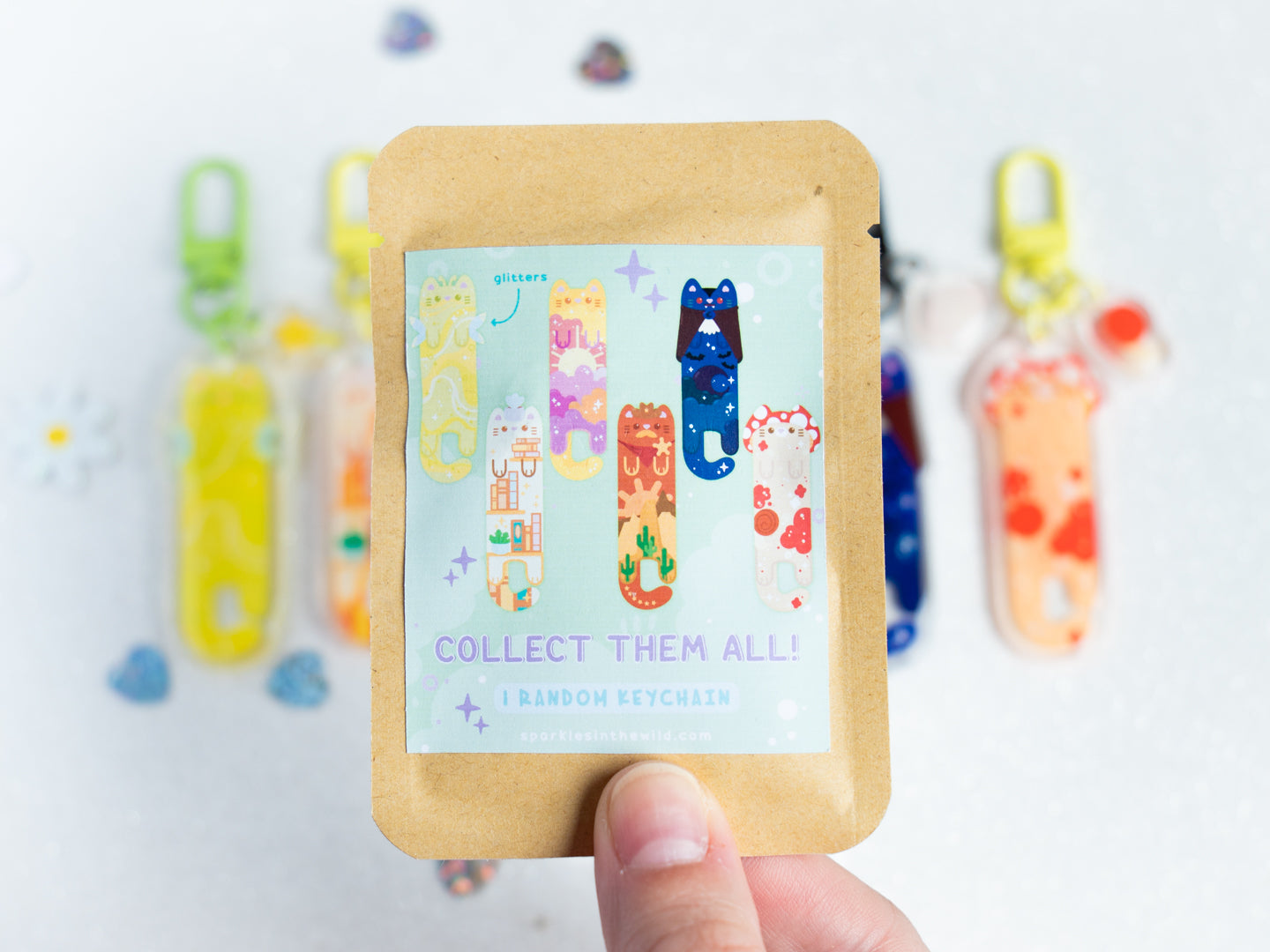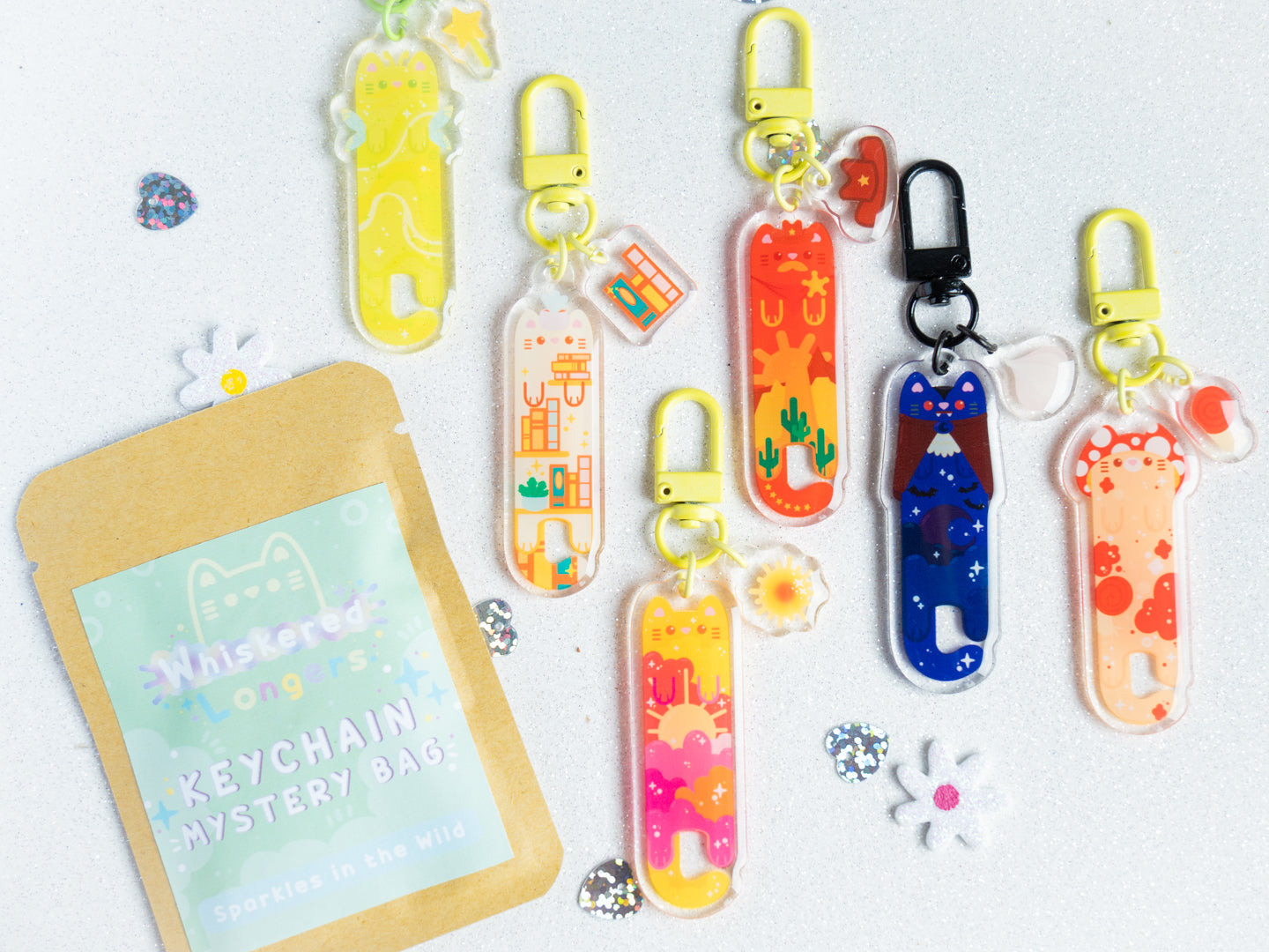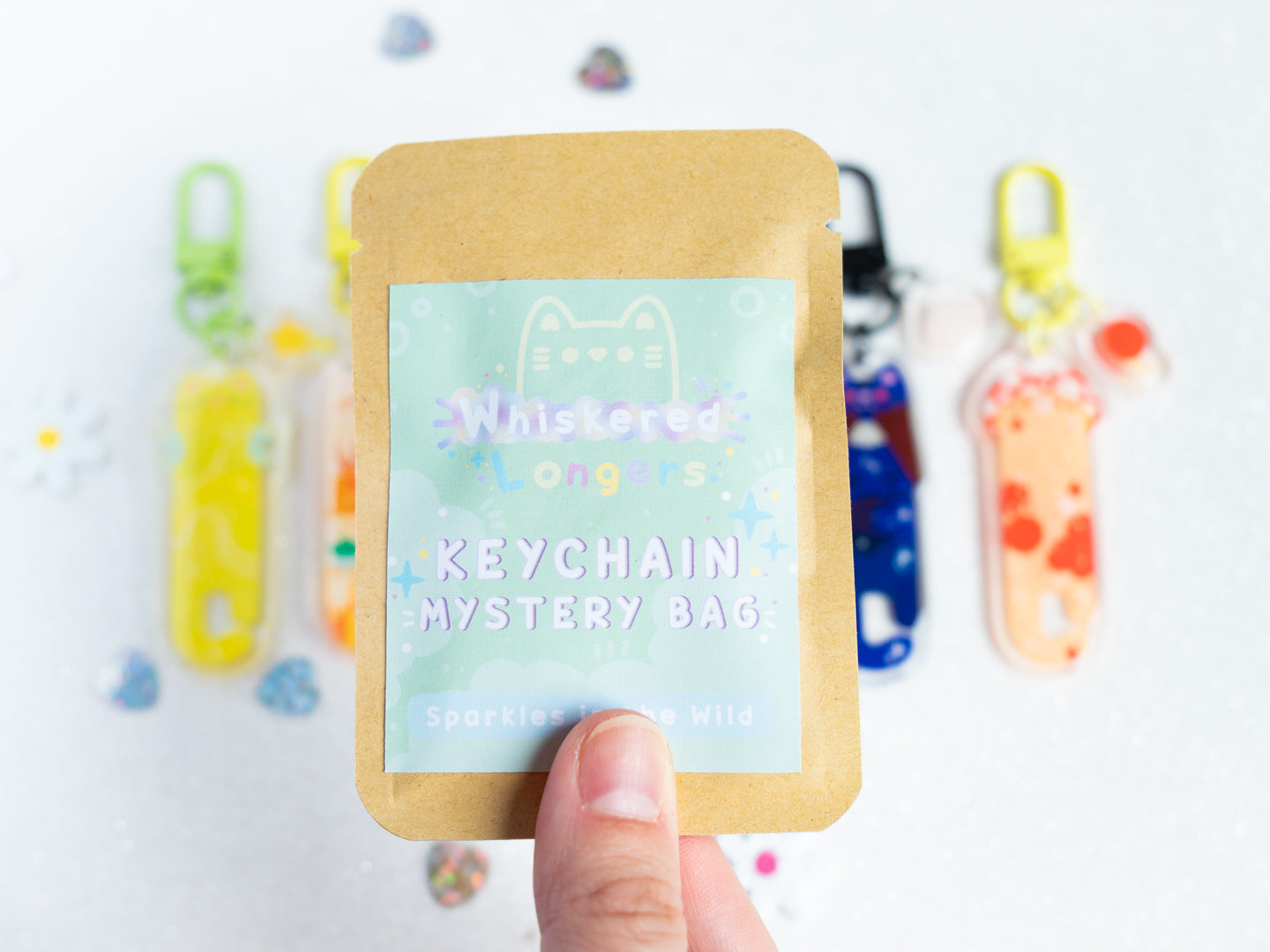 Chaque sac mystère contient un porte-clés de la série verte de la collection Whiskered Longers.
