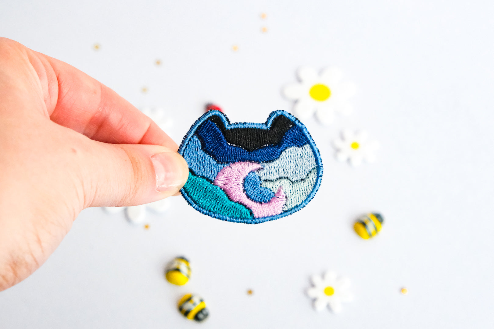 Patch thermocollant brodé chat de nuit avec lune et nuages bleus et violets parfait pour décorer vos vêtements et votre tote bag !