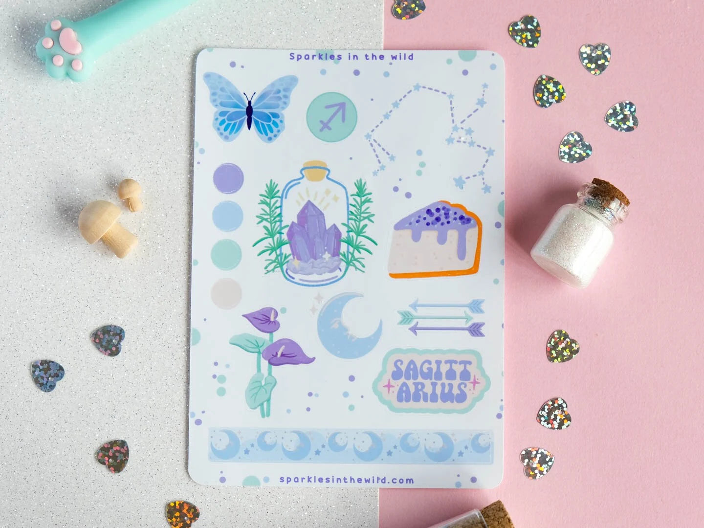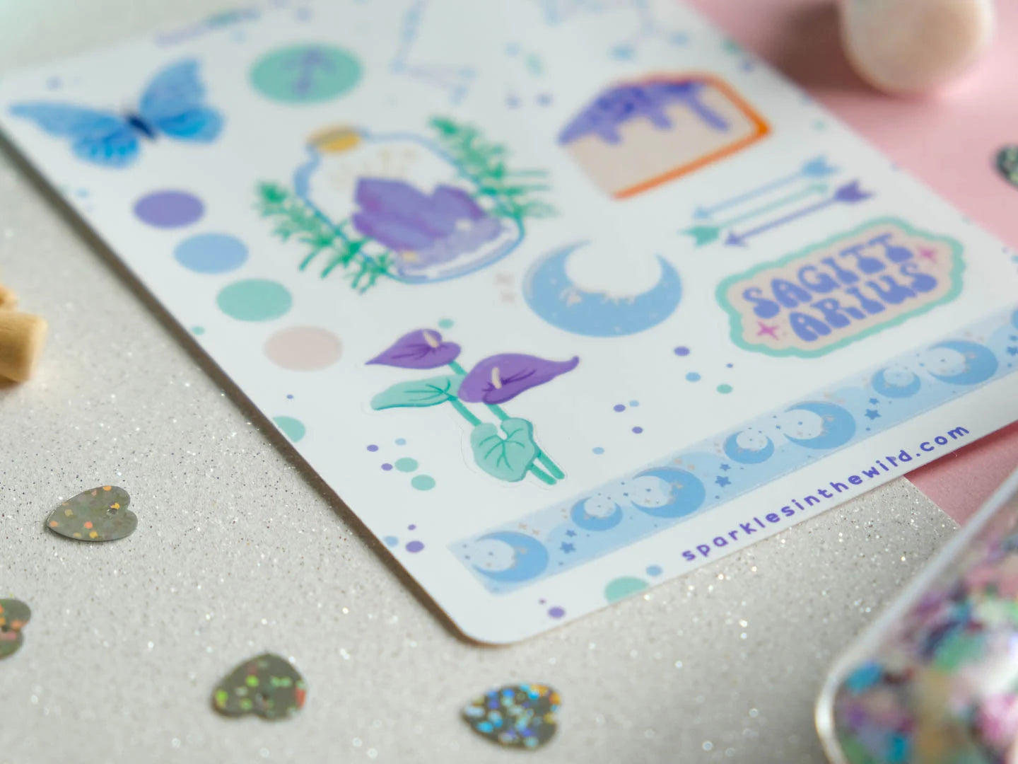Cette feuille d'autocollants comprend une variété de motifs inspirés de l'astrologie, mettant en vedette les symboles du Sagittaire, le signe du zodiaque pour les personnes nées entre le 23 novembre et le 21 décembre.