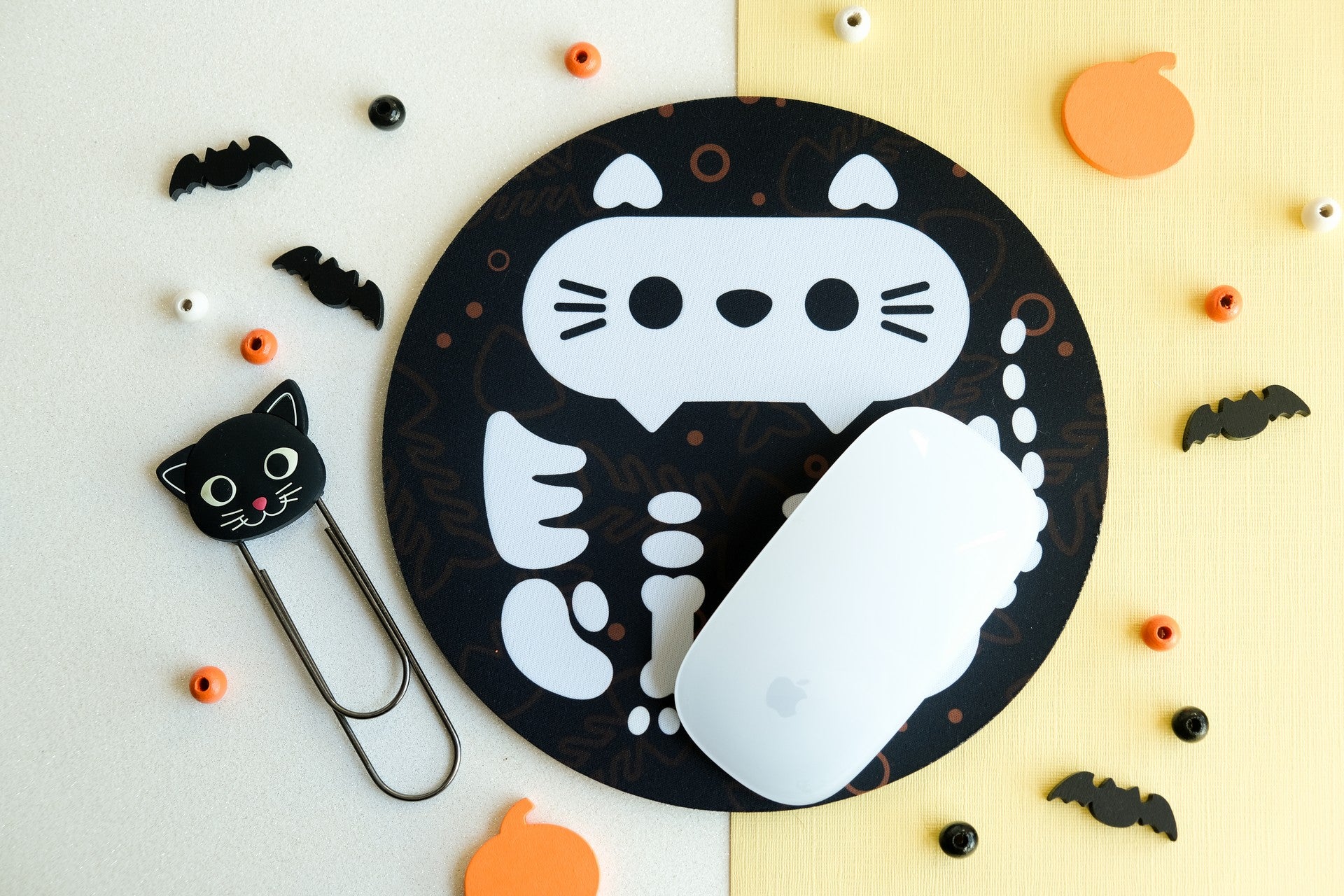 Tapis de souris Chat Squelette parfait pour décorer votre bureau, surtout pendant la saison d’automne ou d’Halloween !