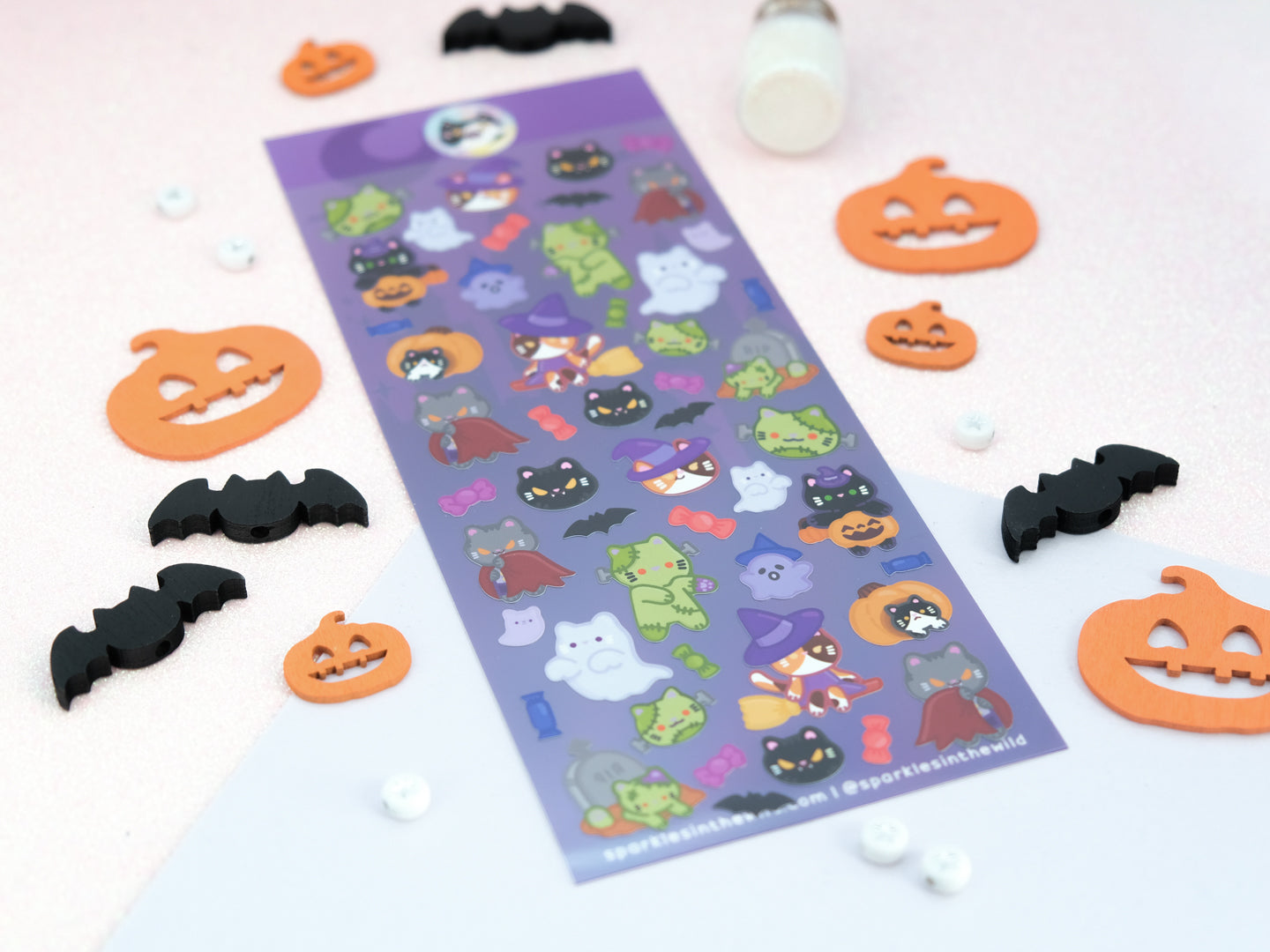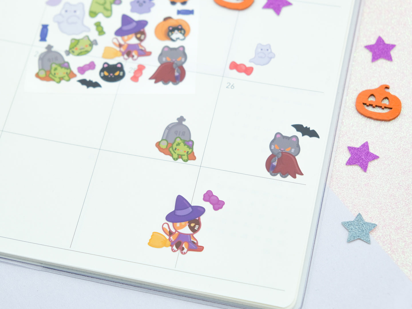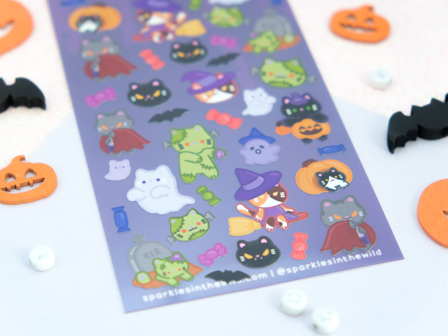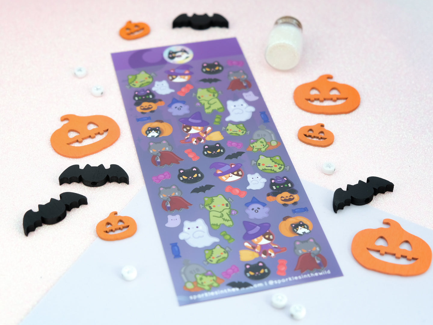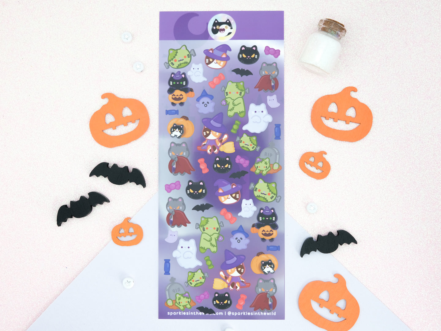 Prêt pour Halloween et rempli de plus de 50 stickers effrayants ! Inspiré par la magie de la papeterie coréenne. Parfait pour les journaux intimes, la décoration, ou tout simplement pour ajouter un peu de "miaou" à votre journée et bien sûr pour Halloween.