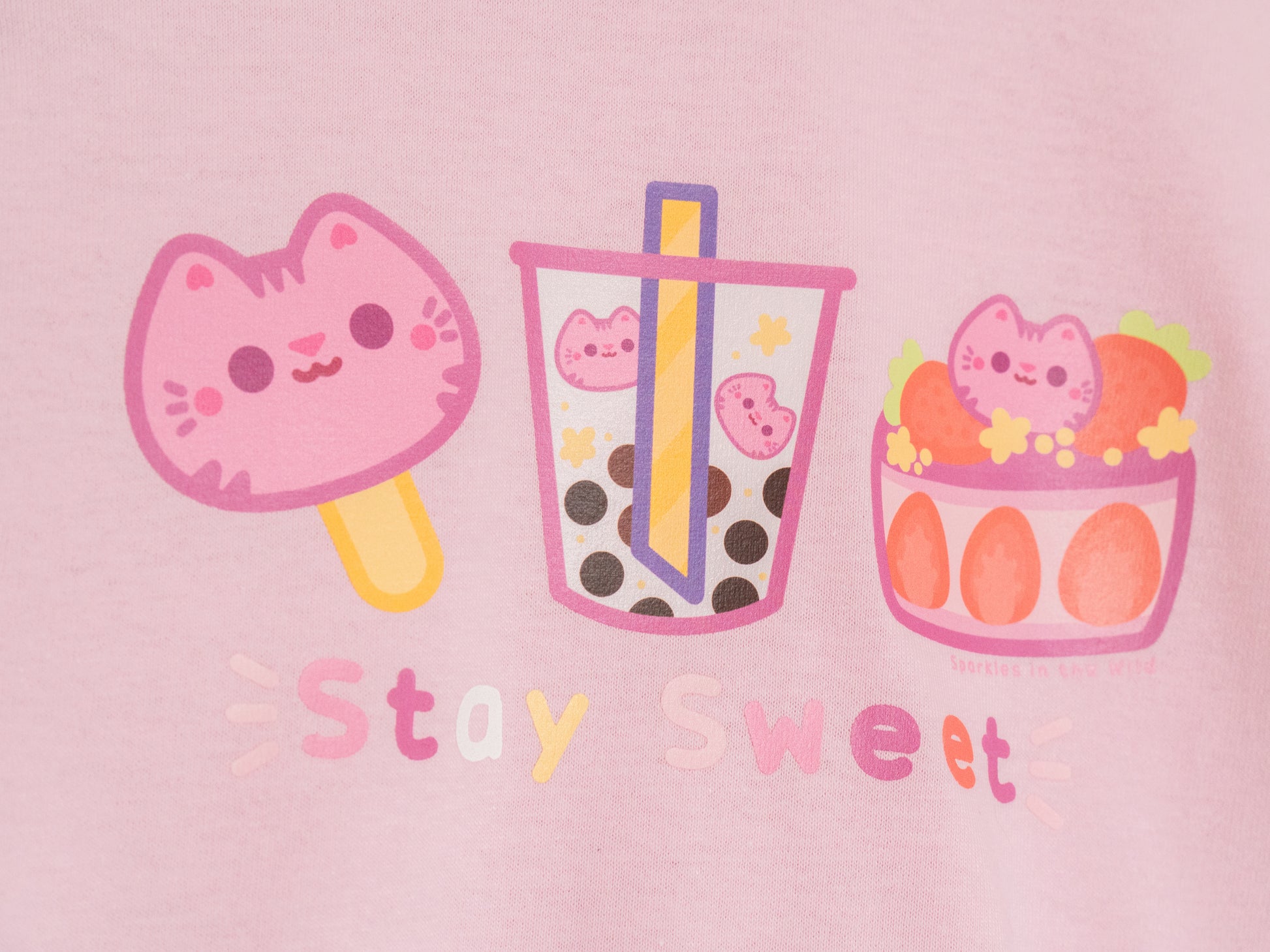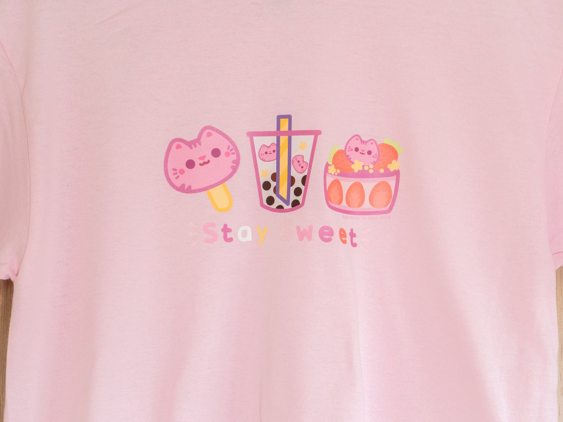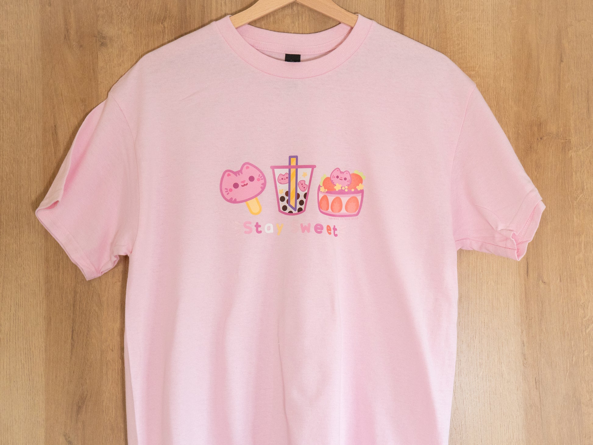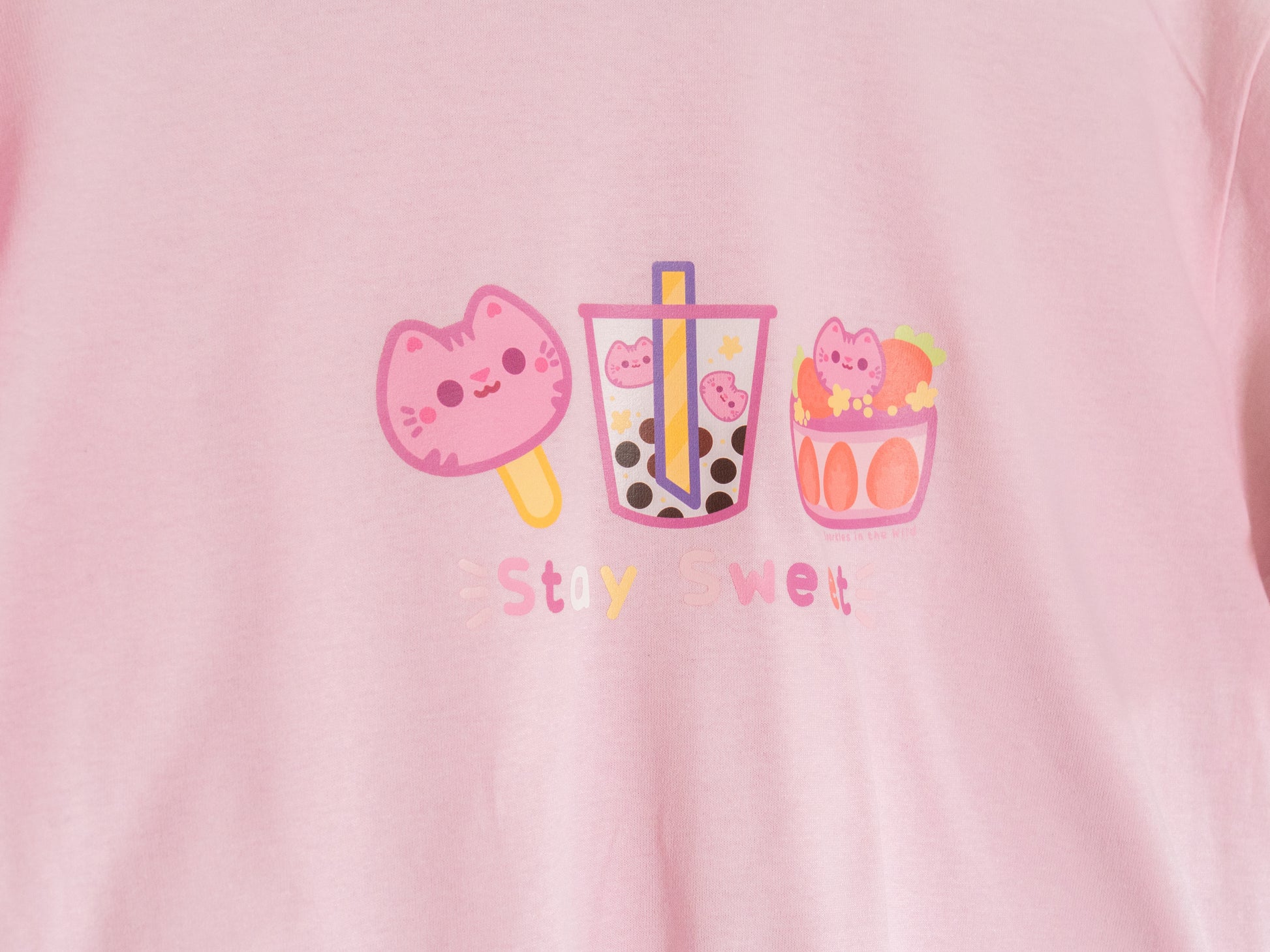 T-shirt mignon avec des sucreries pour tous les amoureux des petites gâteries et des chats ! Couleur rose pale.