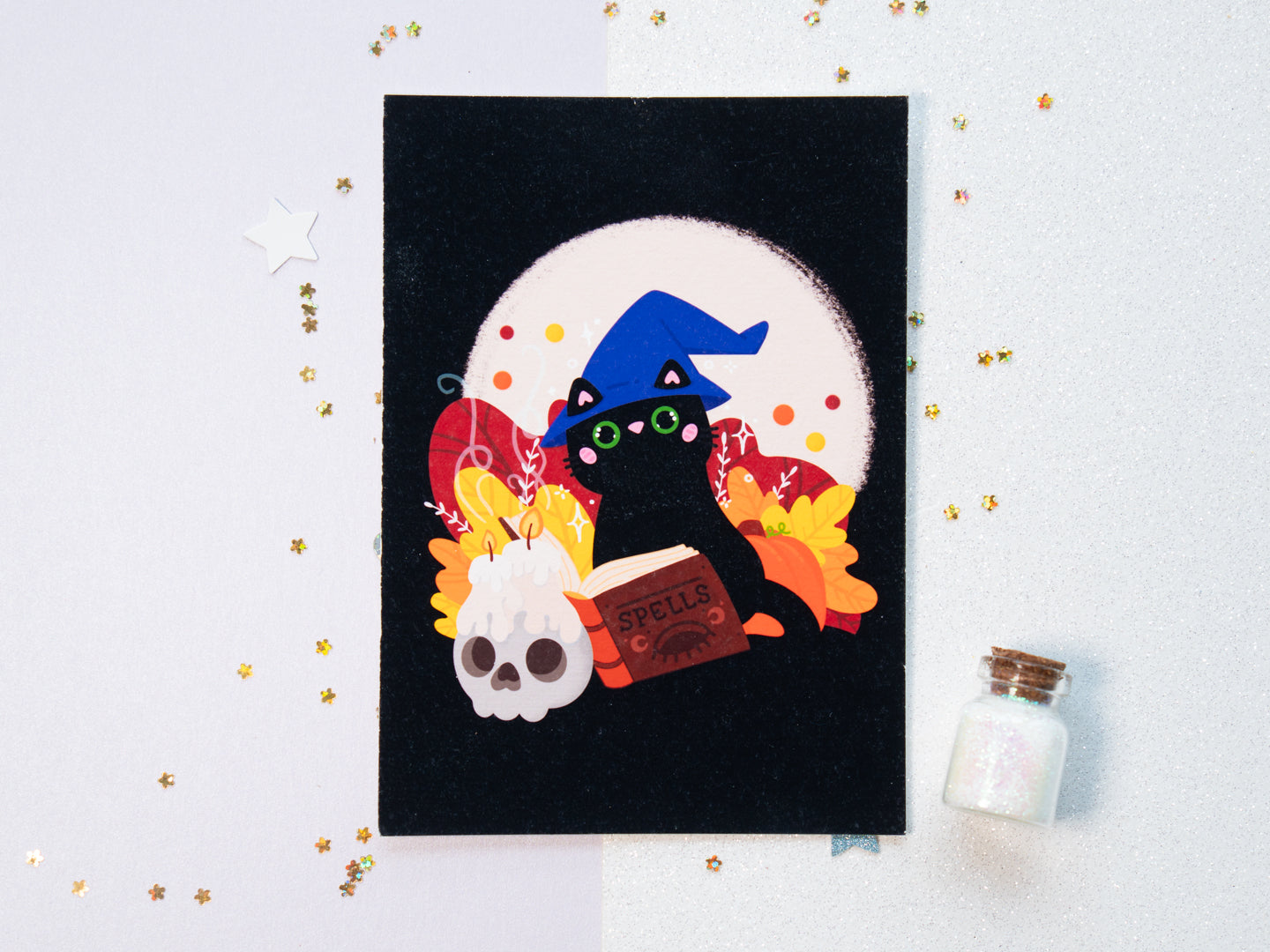 Illustration au format carte A6 avec un joli chat sorcier prêt à vous lancer un sort ! Parfait pour offrir ou décorer votre chambre. Les couleurs peuvent légèrement varier en raison des paramètres du moniteur.
