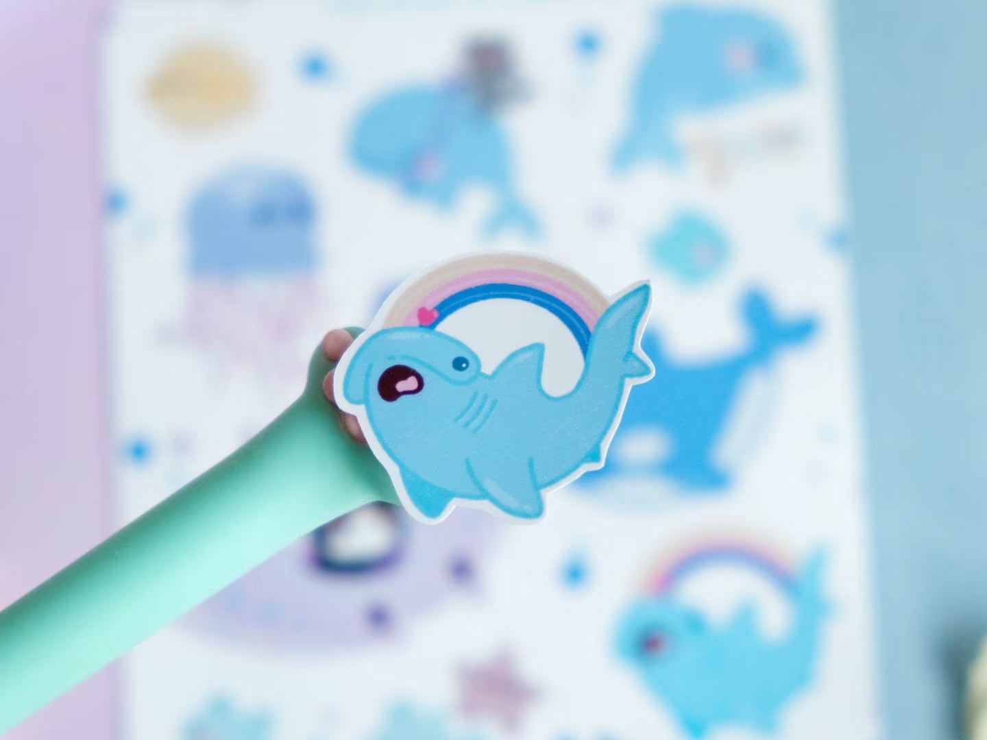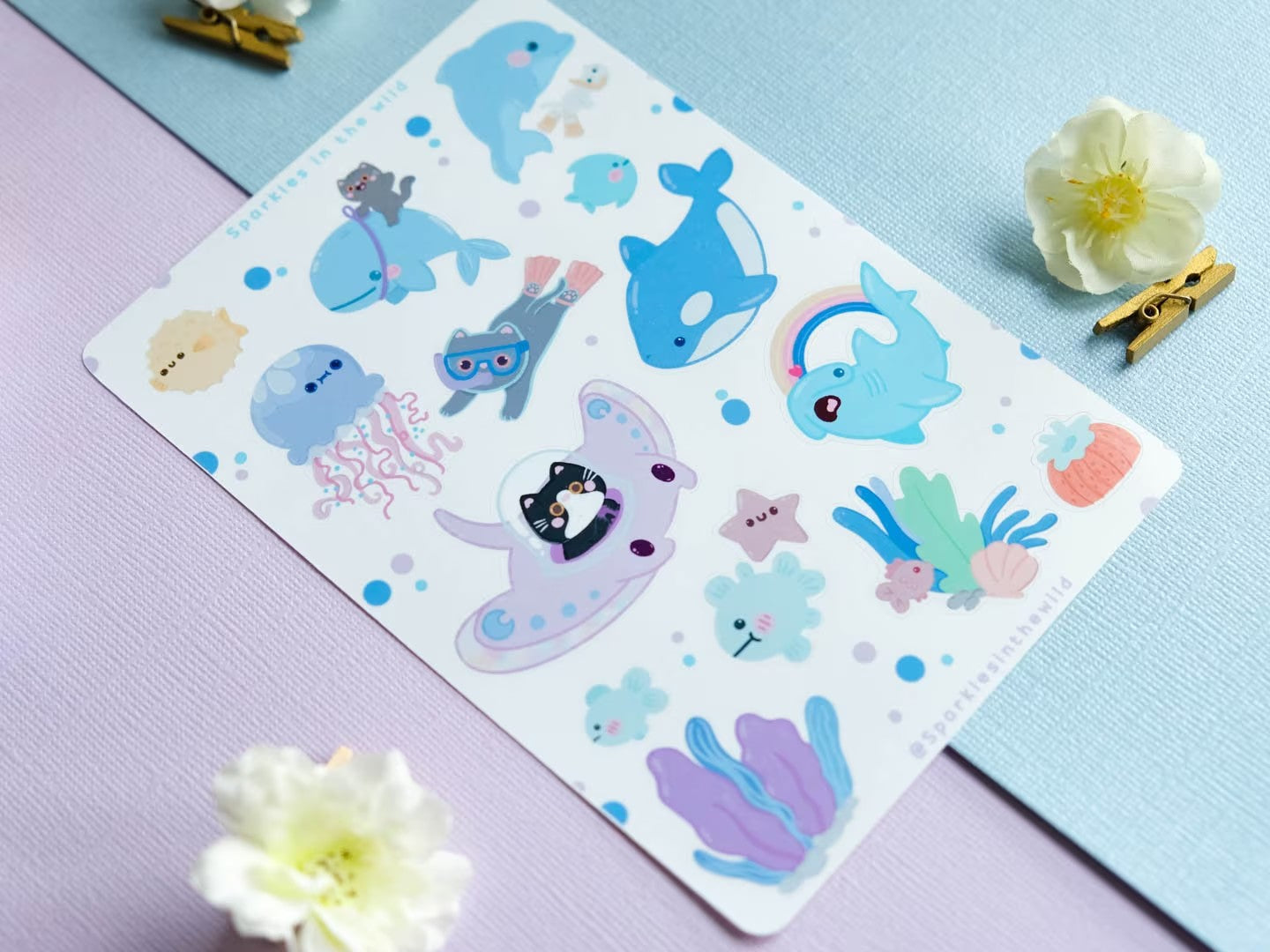 Board of Kawaii Ocean waterproof stickers with dolphins, sharks and cute cats to decorate bullet journals and diaries.